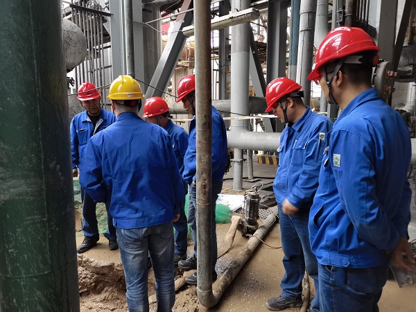 為了確保一期循環(huán)水盡快建網(wǎng),公司總工程師馬軍忙、生產(chǎn)部部長郭淑平、副部長宋國慶及機械修造部、合成車間、物料車間主管領(lǐng)導(dǎo)帶領(lǐng)技術(shù)員在現(xiàn)場根據(jù)實際情況進行了交流討論。形成“開天窗,貼補下方腐蝕管線”精準檢修方案。要求相關(guān)工藝車間加強溝通與協(xié)作,盡快完成循環(huán)水管線泄壓排放,給檢修工作提供便利。