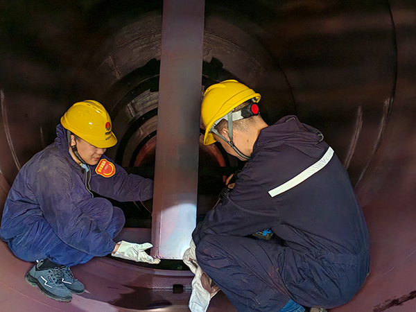 在技術(shù)組長王偉的帶領(lǐng)下,90后徒弟岳維哲正小心翼翼地鉆進(jìn)52鍋爐給水除氧器內(nèi)部?!俺跗鞯淖饔镁褪墙o鍋爐給水‘除氧’,但光知道原理是不夠的,得親眼看看里面長啥樣!”王偉一邊指著內(nèi)部結(jié)構(gòu),一邊耐心地解釋道,聲音在除氧器內(nèi)回蕩?!斑@是深度加熱區(qū),通過提升水溫促進(jìn)氧氣析出;上方的填料層能進(jìn)一步強化除氧效果;注意看這個蒸汽進(jìn)口……”岳維哲時而凝神觀察,時而提出問題,王偉也在耐心地向其解答。走出除氧器后,岳維哲興奮地表示:“以前在課本上看到的平面示意圖,現(xiàn)在變成了立體的實物,每個部件都活靈活現(xiàn),理解起來容易多了!”